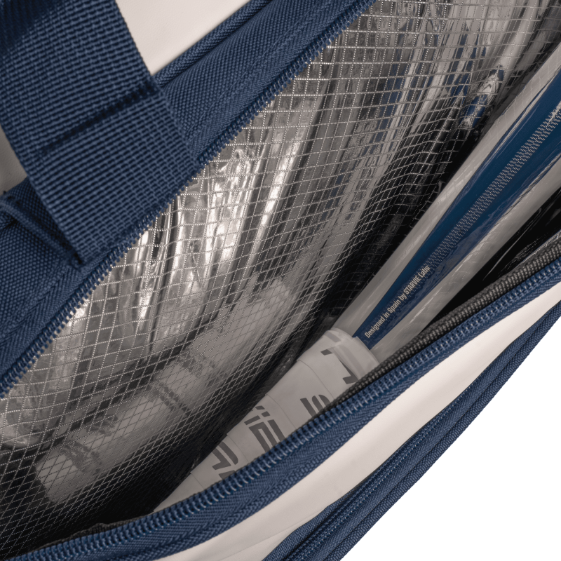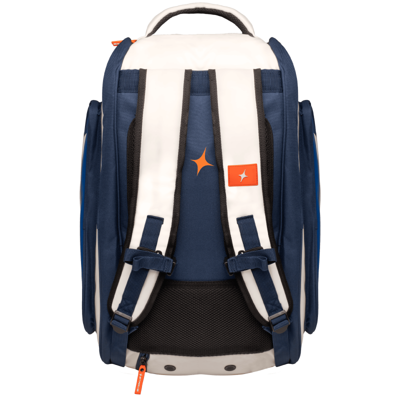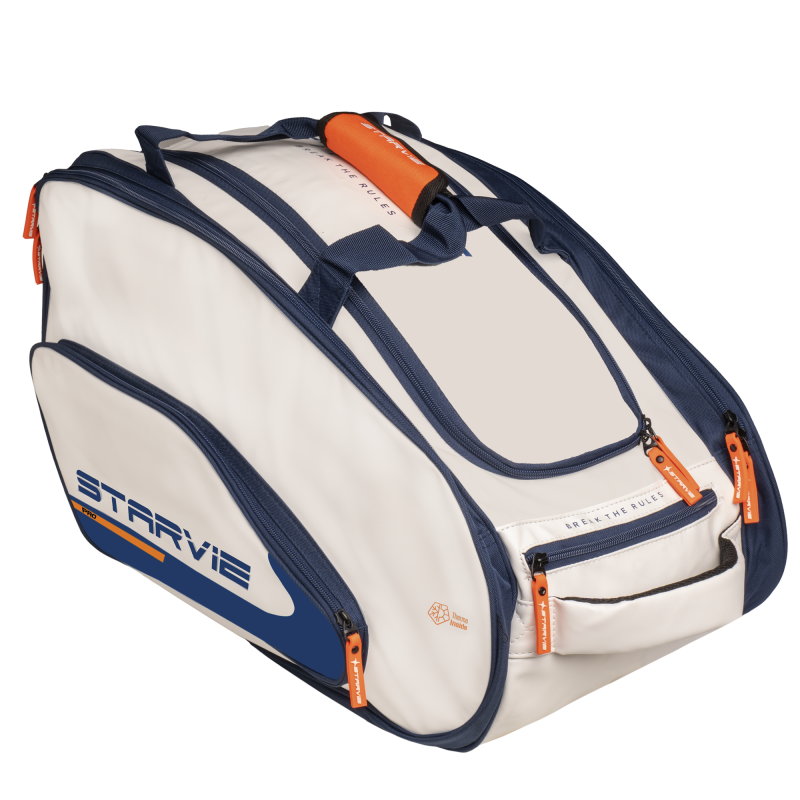 El paletero de pádel STARVIE Tactic Pro está diseñado para jugadores que buscan gran capacidad de almacenamiento y comodidad en una sola bolsa de pádel. Su diseño en tonos blanco, azul marino y detalles en naranja lo convierten en un accesorio deportivo moderno y atractivo, ideal para llevar todo tu material de pádel de manera organizada.